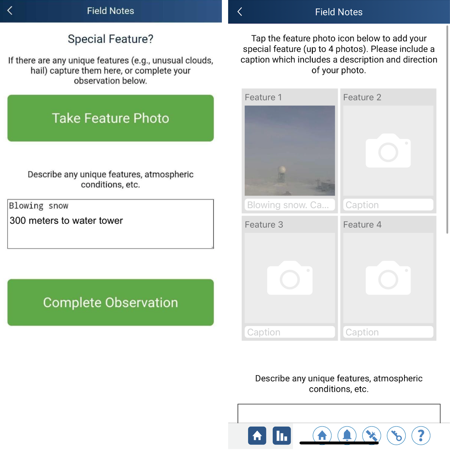High winds and low visibility associated with blowing snow can make for dangerous conditions. If it is unsafe to make an observation outside, you may take a feature photo from inside a vehicle or building. If you are on an upper floor of a building, please include which floor you are on in the photo comments.