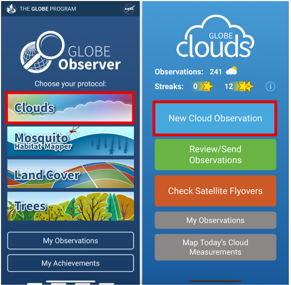 Download the GLOBE Observer app from the Google Play store for Android or the Apple App Store for iPhone. Use an active email address to create an account in the app or via the GLOBE website, then tap "Clouds" and take the short in-app training.