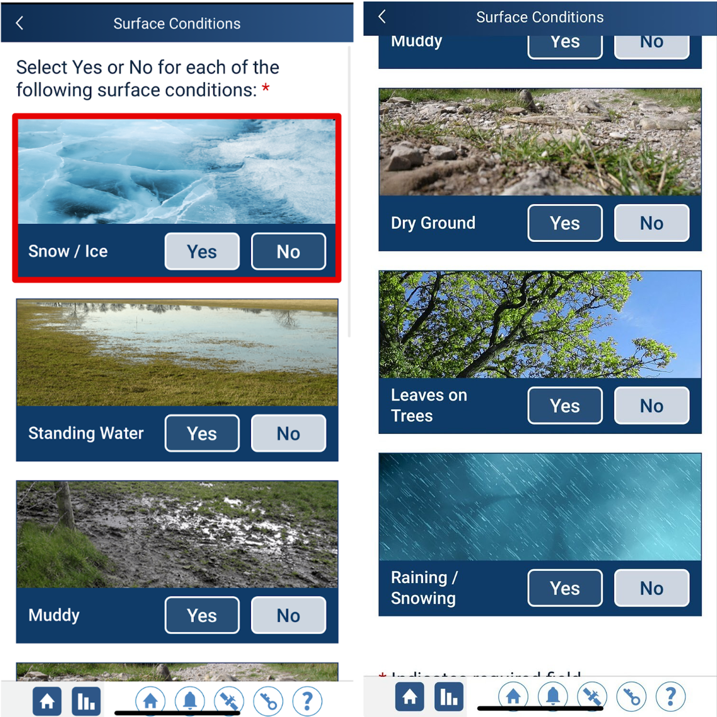 The app will prompt you to record the surface conditions. You are required to answer “Yes” or “No” for each category.