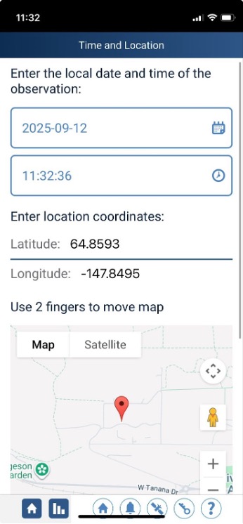 Turn on your location settings if you haven’t already. Your latitude, longitude, and time of day will be filled in automatically by the app! Check to ensure the location is correct. You can move the pin on the map to adjust the location if needed. Once the location is set, scroll to the bottom of the screen and tap Next.